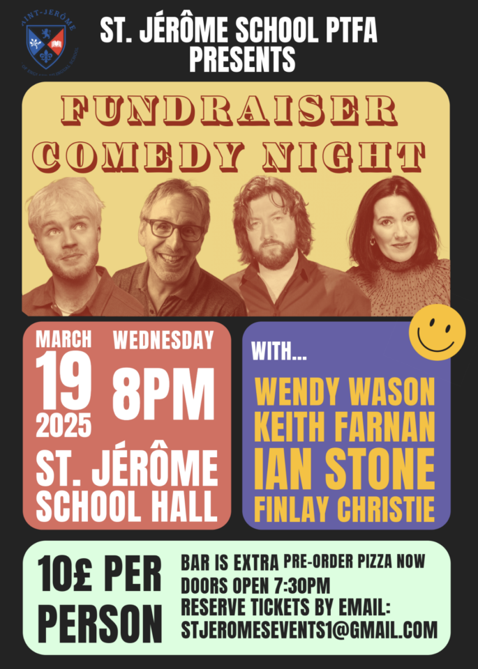 Parents and staff are warmly invited to join our next Comedy Night hosted by Keith Farnan in the school hall. Book your childminder early and join us for an evening of fun and laughter whilst raising important funds for our school.